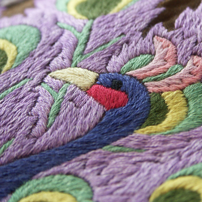 アシメントリーなバッグの形がおしゃれな孔雀柄ショルダーバッグ。孔雀の羽の刺繍がゴージャス感も出しながら、全体の雰囲気はすっきりとまとまっていて完璧なデザインです。