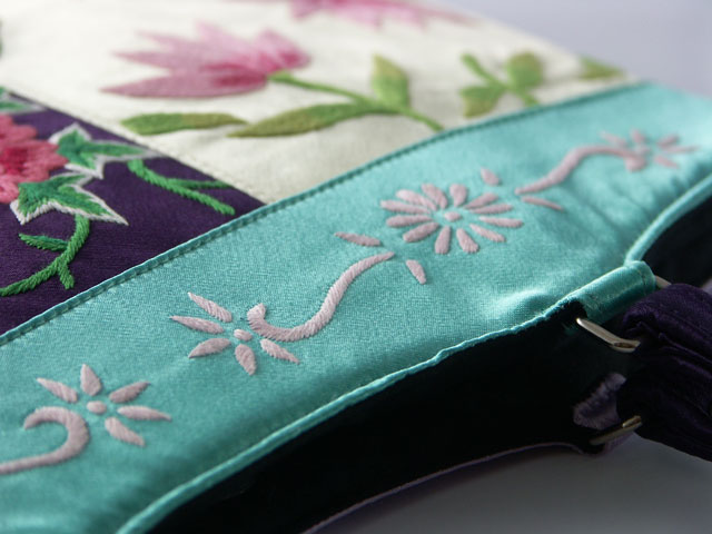 違うタイプのお花の刺繍をパーチワークしたコンパクトなバッグです。(B5サイズが入ります) マチがないので荷物が多い人には向きませんが肩にもかけられるタイプなので便利です。パーティーバッグとしても最適。